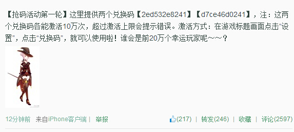 【抢码活动第一轮】这里提供两个兑换码【2ed532e8241】【d7ce46d0241】,注:这两个兑换码各能激活10万次,超过激活上限会提示错误。激活方式:在游戏标题画面点击“设置”,点击“兑换码”,就可以使用啦!谁会是前20万个幸运玩家呢~~