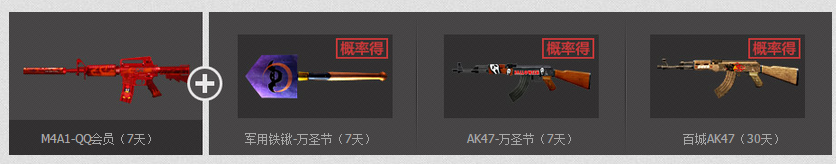 4、活动期间,在本页面开通1个月超级会员即可获得一个月超级服务器+M4A1-QQ会员(7天),同时还可以从军用铁锹-万圣节(7天)、AK47-万圣节(7天)和百城AK47(30天)中随机获得一件;