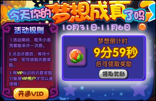 洛克王国梦想成真活动在10月31日开始了,小洛克们到南瓜屋许愿就可以获得奖励了哦!VIP用户可以许愿专属奖励,下面小编就给大家详细介绍洛克王国梦想成真活动吧。