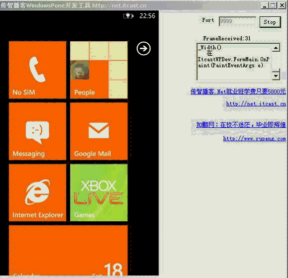 因为Mango之前的WP7只支持通过WebClient访问Http网络,无法编写普通Socket程序(除非用上面的方法调用Dll),因此服务器端我用一个Http服务器接收客户端提交上来的截图图片流然后显示出来即可,服务器端我用了一个开源的嵌入式http服务器“C# WebServer”(本地下载包),这样避免部署IIS,直接启动WinForm程序就能运行服务器,手机端通过WebClient来提交截屏的数据。服务器端和客户端的实现都是普通的.Net操作,不再详细讲,感兴趣的可以参考传智播客的.Net免费视频教程。