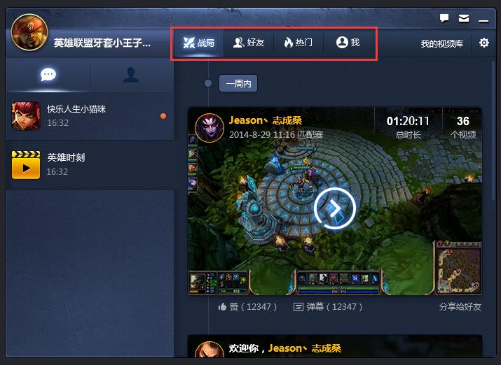 当您开启我们的功能,我们将自动为您录制游戏视频,并智能记录您在游戏中的经典击杀镜头,三杀五杀什么的,不再只是截图!同时还能为您的英雄时刻添加各种特效,并一键分享到LOL游戏圈哦!