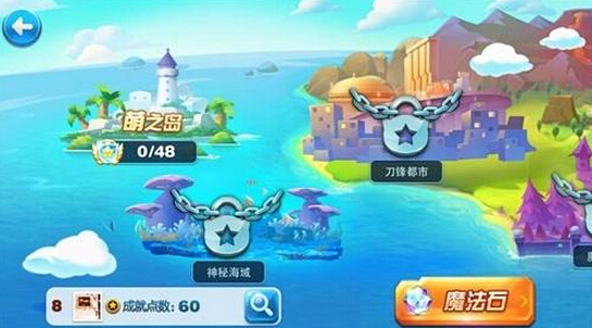 萌之岛是玩家进入冒险模式后自动开启的,而后神秘海域需要玩家完成萌之岛的25个成就才能开启,刀锋都市需要完成神秘海域的25个成就开启,魔法城堡需要完成刀锋都市的25个成就开启。玩家可以点击相关的区域在游戏开始界面查看自己的任务完成情况。完成成就任务之后有丰富的钻石、积分、金币还有宠物蛋奖励。