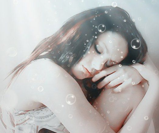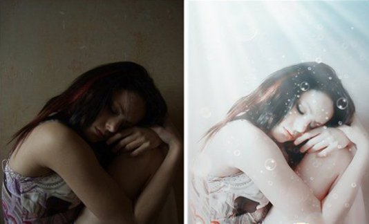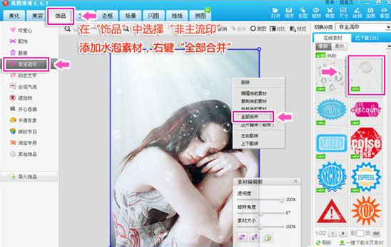 6、在海底怎么能少了水泡呢!别急,在“饰品”菜单中找到气泡的素材添加上去,调节透明度后,再右键将所有的素材“全部合并”。