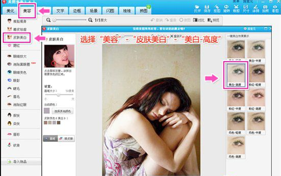 1、打开图片,首先美化图片,执行“美容”-“皮肤美白”-“美白-高度”。