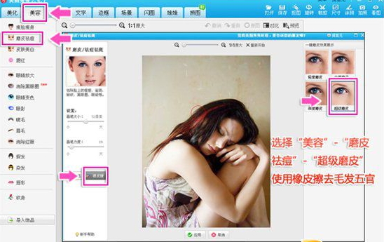 2、给人物磨皮,选择“美容”-“磨皮祛痘”-“超级磨皮”,再用橡皮涂抹出人物五官、头发,保留细节部分。