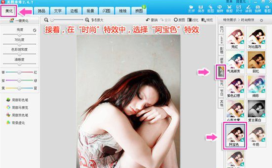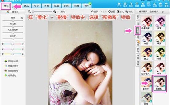 3、在“影楼”特效中选择“粉嫩系”,让人物瞬间气色变得很好。