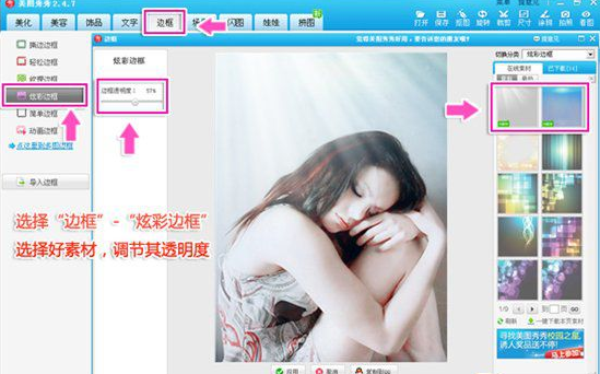 5、虽然生活在海底,但还是少不了和煦的阳光。这里可以在“炫彩边框”中找到合适的光线素材,和适合海底的蓝色素材边框。添加好后,调节透明度至适当。