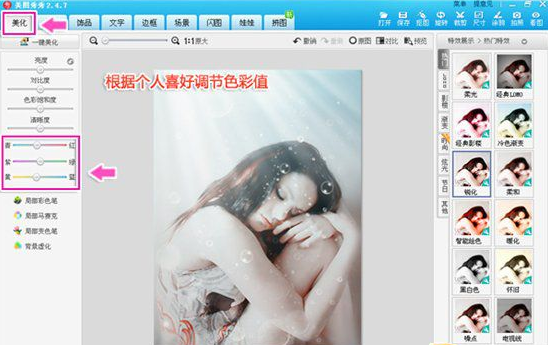 7、最后回到“美化”菜单,调整图片的色彩值到满意为止。