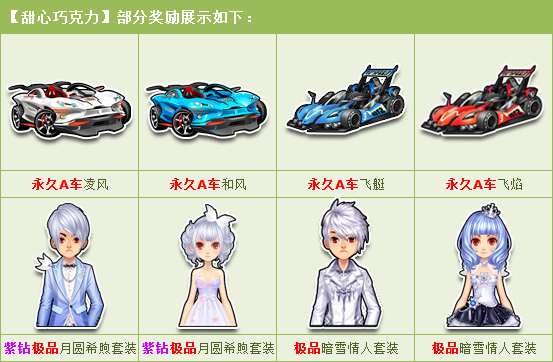 qq飞车甜心巧克力部分极品奖励展示如下: