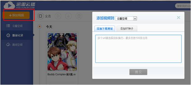 提交视频文件的BT种子或下载链接,即可由迅雷云端下载,并转码成标准格式,