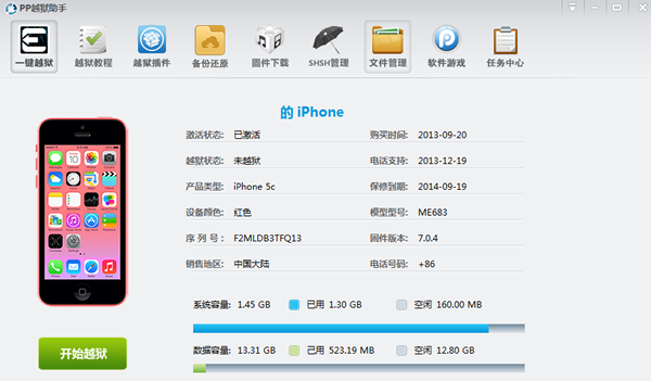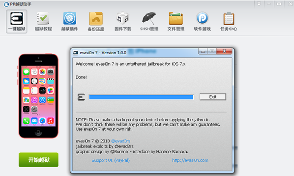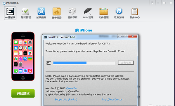 第三步:PP越狱助手自动识别iOS设备与固件版本自动弹出越狱【evasi0n7】工具。