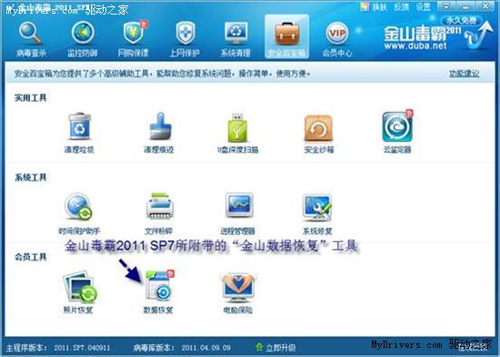 二、接着找到金山毒霸2011所附带的“数据恢复”工具;