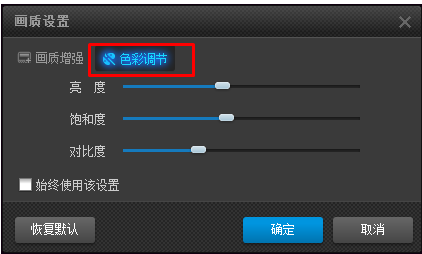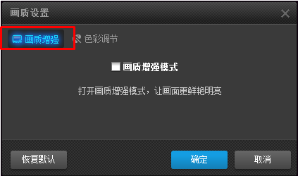 3、画面设置对话框中,可在“色彩调节”选项中调节画面的亮度、饱和度、对比度、在“画质增强”选项中勾选“画质增强模式”让画面更鲜艳明亮。