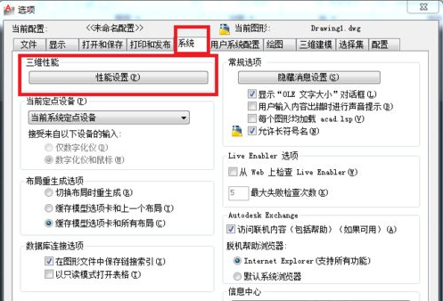 2、在选项窗口中,选择“系统”--“性能设置”,如下图所示: