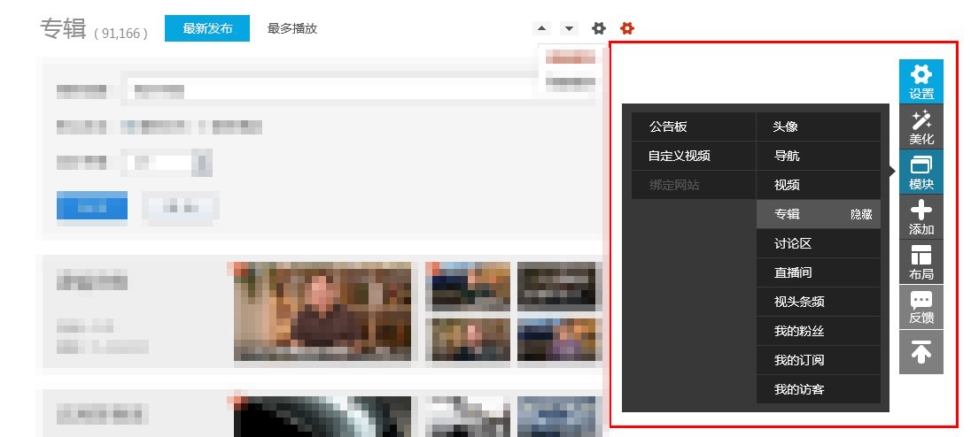 点击右侧的【设置】工具条,展开后点击【模块】,在【模块】列表中,您可以隐藏某个模块。例如下图要隐藏专辑模块,鼠标滑过时点击右侧的隐藏即可,如果想要设置为显示,重复之前操作点击显示即可。