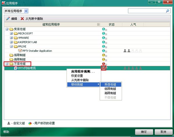 4、打开不信任组,找到PPTV网络电视,点击红色小圆点,选择移动到->受信任组