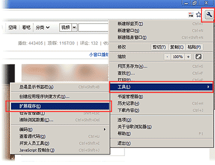 1、点击谷歌浏览器"扳手"图标" > "工具" > "扩展程序"(如下图)。