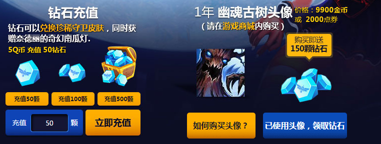 1、在活动页面上使用Q币充值钻石,5Q币充值50钻石。在游戏客户端购买并使用期限头像”幽魂古树”,赠送150钻石,单个大区头像只限购买一次。充值的钻石会在页面上显示。
