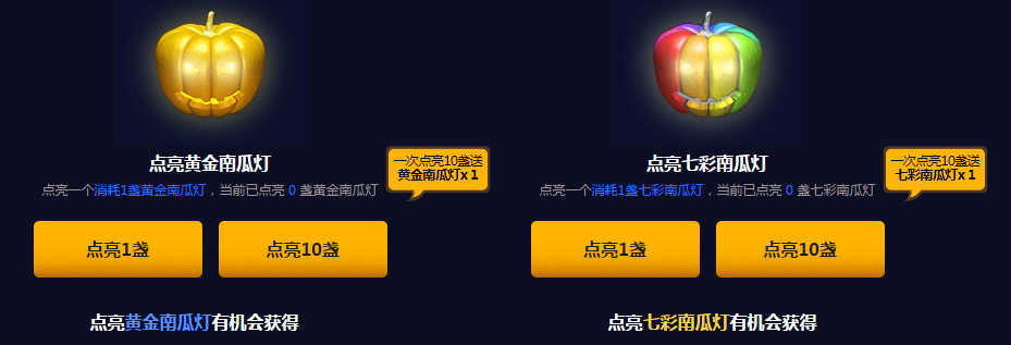 5、本次活动提供“点亮10盏”功能,每次使用”点亮10盏”功能会额外赠送并点亮1盏对应等级的南瓜灯。