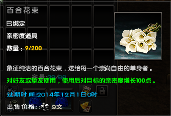 百合花束:绑定,对目标玩家使用后提升亲密度100点。