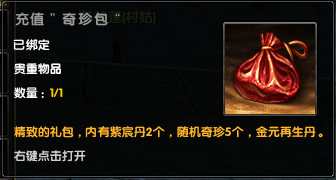 2、充值奇珍包打开之后可以获得紫宸丹2个,随机奇珍5个,金元再生丹1个。