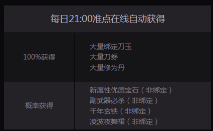 活动内容:可在商城购买111刀玉的“光棍宝箱”打开礼包后随机获得以下物品的其中1种,限时特惠,机会难得。
