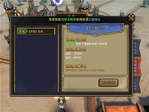 游戏左边的中间部位,点击任务可接任务,可以接受支线任务,经验和金币也不错