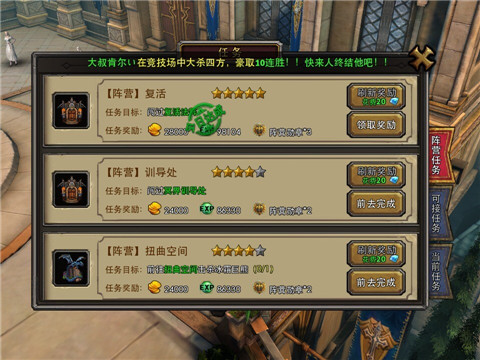 每日活动中的阵营任务,相当于日常,每天刷新一次,刷新星级的话,可以提高获取经验和金币,勋章的作用是可以提升阵营勋章值,能带来称号改变,用金币升级的话还有属性加成