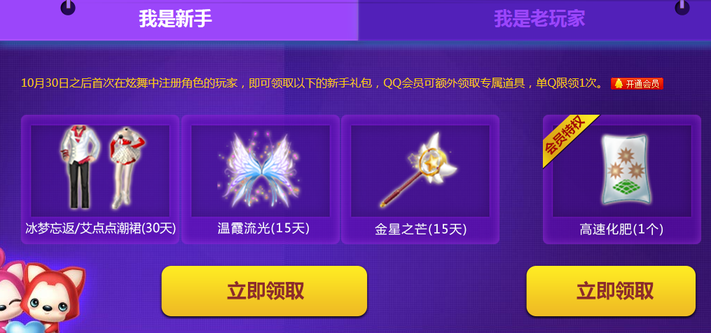 6.在11月1日之后首次在炫舞中注册角色的玩家,即可领取新手礼包,QQ会员可额外领取专属道具,单Q限领1次;