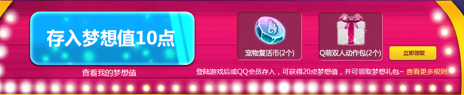 登陆游戏后或QQ会员存入,也就是说出自己的梦想,即可获得20点梦想值,并可领取梦想礼包~