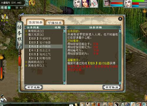 活动流程:通过完成【组队】追讨仙器任务获得的全部情报,幕后黑手才会现身。出现幕后黑手去,玩家可组队前往挑战,打幕后黑手需要选对情报中出现的暗号才可以进入战斗中。