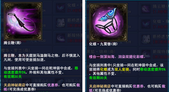 在双十一活动期间,充值活动获取的优惠券能兑换成多种版本,满足不同玩家的需求。化蝶-乘风为加速66%双人坐骑,化蝶-九霄辔则能和普通坐骑“化蝶”为双人坐骑,同时在原坐骑速度基础上再加速5%,如果你对自己的坐骑情有独钟的话,腾云鞭则能使它再加速5%,并保留原外观。