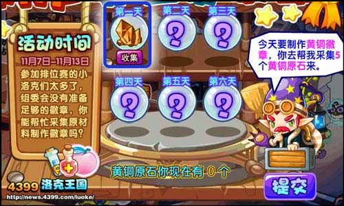 2、根据活动面板上的提示,第一天前往拉布朗铜矿场收集黄铜原石,完成5个原石的采集后,就可以返回活动页面提交领取奖励了哦!