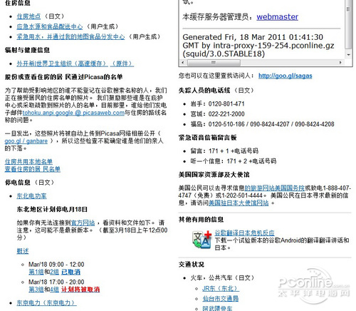 谷歌这个“日本资源危机”网页不仅仅为网友提供了善款捐献的平台,还提供了大量关于灾区情况的信息、查阅日本灾情的各种途径。