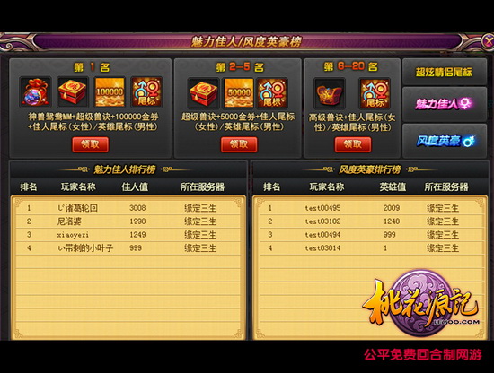 11月11日光棍节当天,还有“魅力佳人/风度英豪榜”活动。活动奖品除了鸳鸯MM礼包、超级兽决宝盒之外,还将送出游戏首款情侣尾标!桃花源里最长情的告白也莫过于此了吧!
