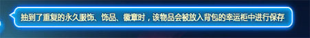 01. 在多宝八音盒或梦想时光机中抽奖获得了背包中已有永久期限的重复服饰、饰品、徽章,该物品将被自动存入背包里的“幸运柜”;