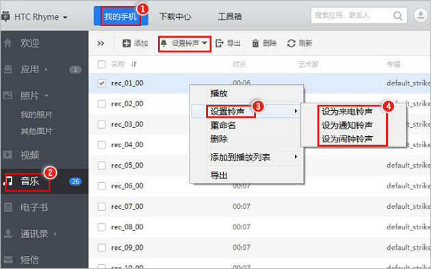 在“我的手机=》音乐”模块,选择喜欢的音乐,选择“设置铃声”或者右键选择“设置铃声”即可。同时,还可以“设置通知铃声”和“闹钟铃声”。