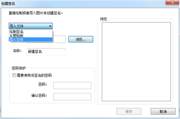 在“创建签名”对话框中,选择“绘制签名”、“导入文件”或“从剪贴板”来创建签名。