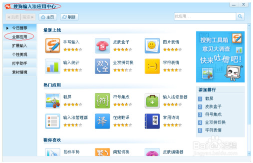 4、在“搜狗输入法应用中心”中点击“全部应用”选项。在“全部应用”中找到“在线翻译”,然后点击“添加”即把它加入到了搜狗工具箱。
