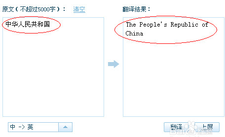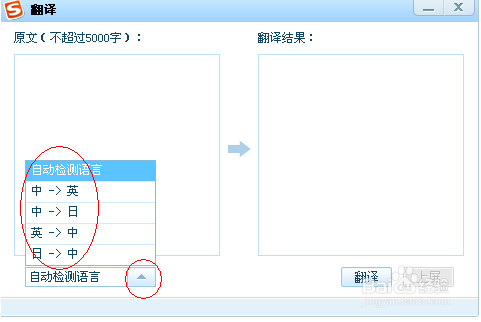6、在左侧的“原文”框中输入要翻译的原文,然后点击“自动检测语言”右侧的向上箭头选择:“中文—英文”,“中文—日文”,“英文—中文”,“日文—中文”,点击“翻译”,译文就会出现在“翻译结果”框中。