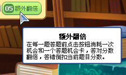每一题答题前可以通过点击"基本翻倍"按钮,获得当前答题分数翻倍的奖励,答错扣除当前题分数(20)。