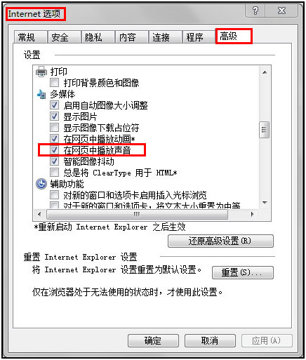 2、请查看 Internet 选项 -> 高级 -> 多媒体 -> 播放网页中的声音是否勾选,如下图所示。