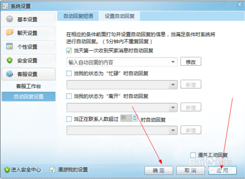 6、选择成功之后在这里也可以输入自己的需要自动回复的用语,这里和步骤四不同的是可以设置第一次联系我们旺旺和第二次联系旺旺的自动回复用语。