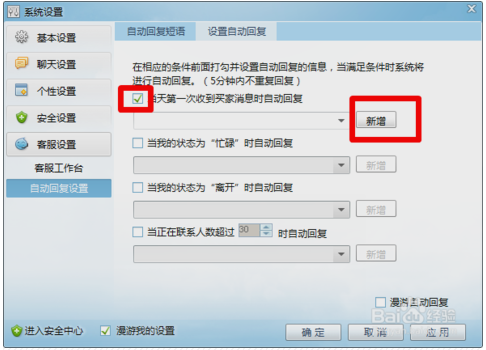 5、与此同时我们可以设置多个要求的自动回复用语,我们选择“新增”选项。选择“新增”选项之后我们继续选择右侧“添加”