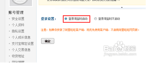 3、接下啦,在左侧的菜单列表中你会看到“旺旺网页版设置”然后选择打开。然后勾选“登陆淘宝时启动”,确定后保存设置及重新登陆淘宝网。(阿里旺旺网页版本是为那些没有安装阿里旺旺客户端的用户提供的交流工具。无需下载和安装,使你和卖家(朋友)可以自由沟通交流,即时收到交易的提醒~!)