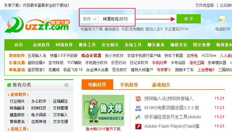 2、打开东坡主页,搜索框内输入“阿里旺旺2015”,点击【搜索】进行下载
