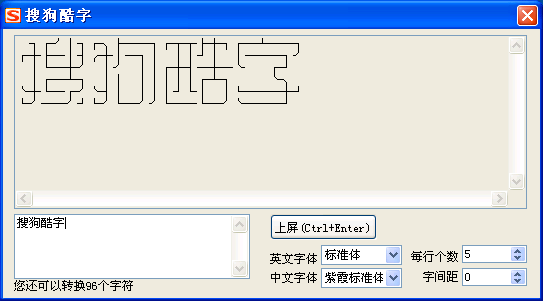 搜狗酷字是搜狗拼音输入法1.5测试版推出的一个非常有趣的服务,将可能包含好几种好玩的特殊文字输入功能。目前搜狗酷字主要包括紫霞字符字。