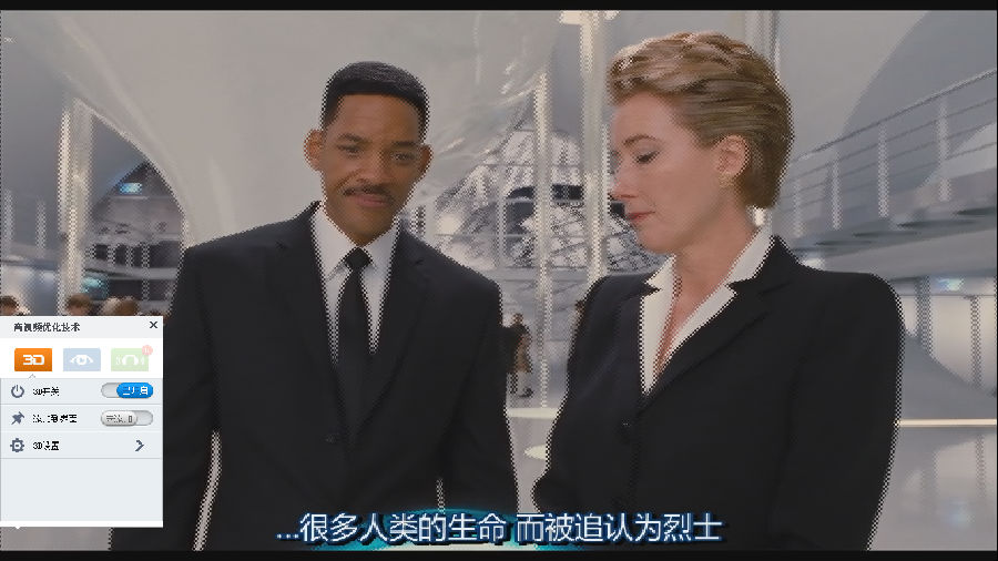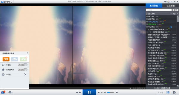 3、打开一部3D影片,播放界面会出现左右两个画面,这是“左-右影片片源”的原始格式。点击3D键后,经过处理才呈现正常的3D效果。同样,2D转3D功能原理亦是如此,在开启3D功能进行处理后,才开始显示成我们在电影院里看到的3D画面。