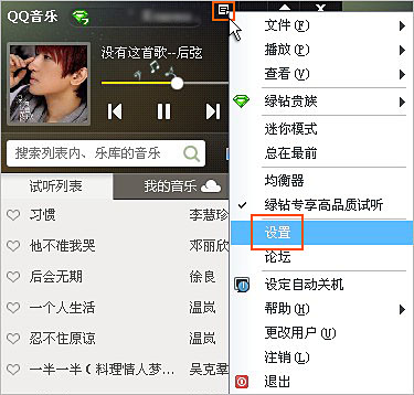 1、登录QQ音乐播放器,打开“主菜单”后点击“设置”(图例为QQ音乐2012);