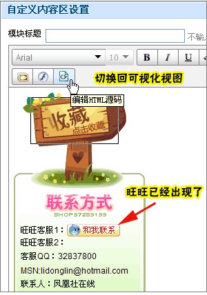 下图范例中,我们就将旺旺插入到了左侧的收藏模板中,找到要添加代码的“自定义内容区”模块,点击编辑按钮: